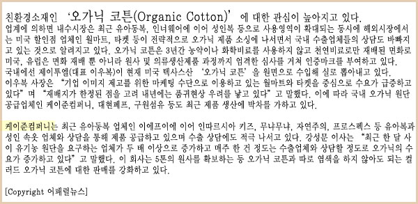 ģȯ°æ¼ÒÀçÀÎ ¡®¿À°¡´Ð ÄÚÆ°(Organic Cotton)¡¯¿¡ ´ëÇÑ °ü½ÉÀÌ ³ô¾ÆÁö°í ÀÖ´Ù.
