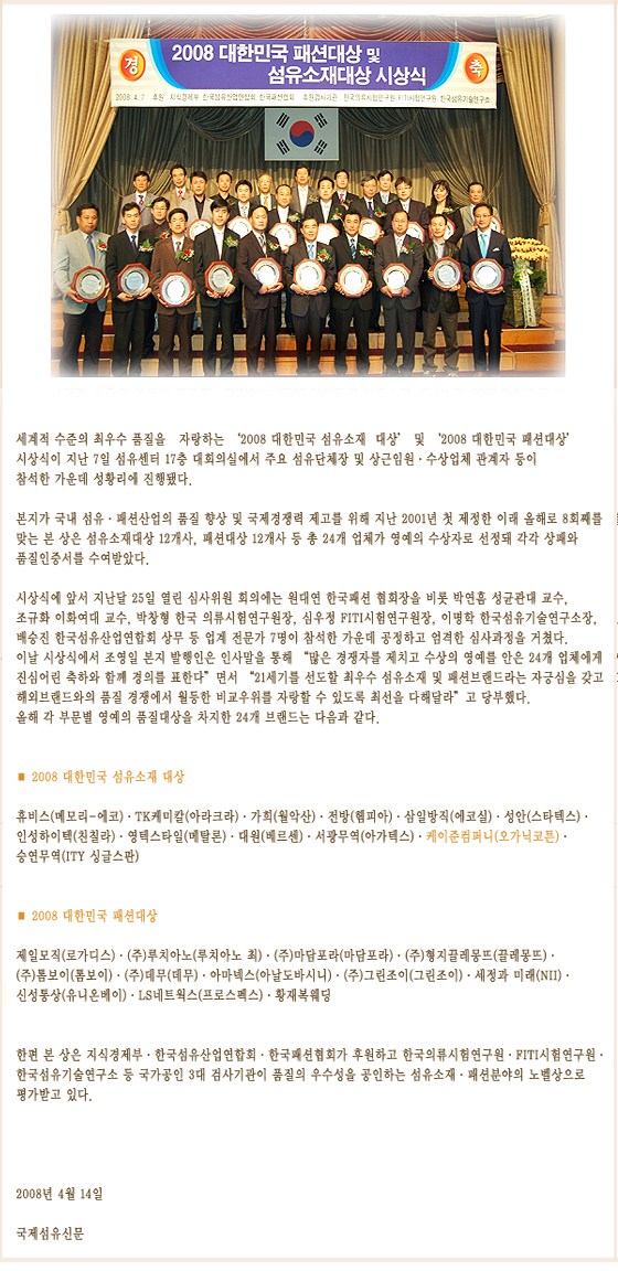 ¼¼°èÀû ¼öÁØÀÇ ÃÖ¿ì¼ö ǰÁúÀ» ÀÚ¶ûÇÏ´Â ¡®2008 ´ëÇѹα¹ ¼¶À¯¼ÒÀç ´ë»ó¡¯ ¹× ¡®2008 ´ëÇѹα¹ ÆÐ¼Ç´ë»ó¡¯ ½Ã»ó½ÄÀÌ